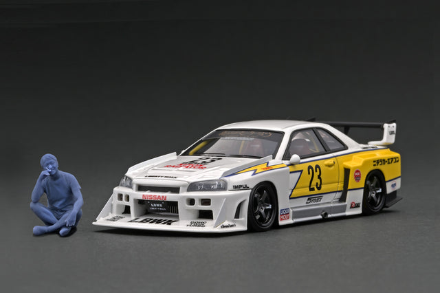 Ignition Model 1:43 Nissan Skyline (ER34) Super Silhouette LBWK in White and Yellow with Mr. Kato Figure