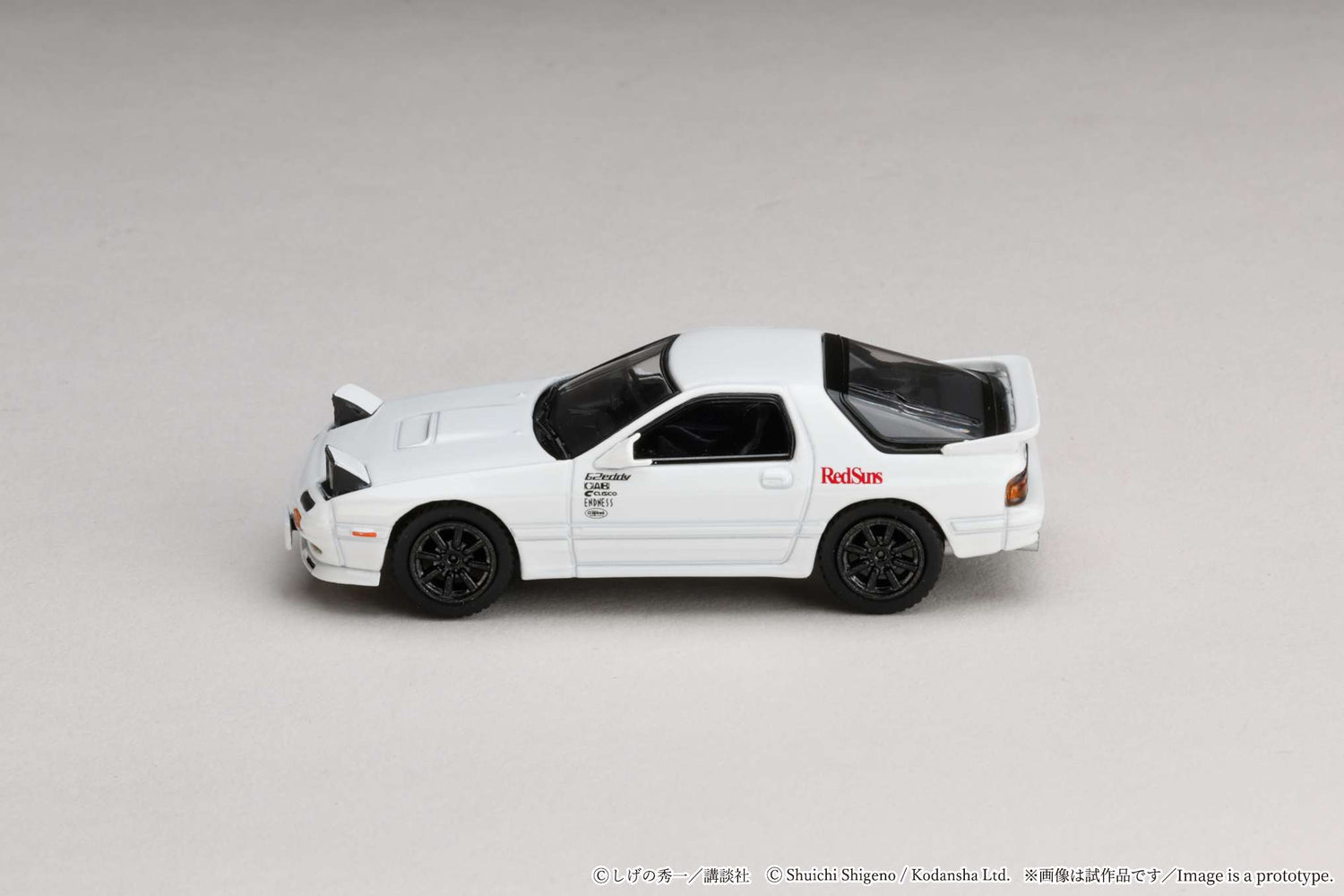 Hobby Japan 1:64 Mazda RX-7 (FC3S) from Initial D, featuring Ryosuke Takahashi’s RedSuns RX-7 in the iconic battle vs Kyoichi Sudou. A must-have collectible for Initial D, Mazda, and JDM fans.